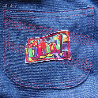 Die Jeans hat auf den Taschen eine Applikation aus Jersey-Stückchen - "style" auf der Potasche und "cool" auf der rechten Vordertasche. Ich finde das cool. :-)